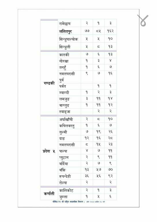 यस्तै हालसम्म नेपालका तीन जिल्ला कोरोना संक्रमण मुक्त भएका छन् । मनाङ, मुस्ताङ, डोल्पामा हाल कोरोना संक्रमितको संख्या शून्य रहेको मन्त्रालयले जनाएको छ । भने हालसम्म काठमाडौंसहित ललितपुर, भक्तपुर, सिरहा, मोरङ