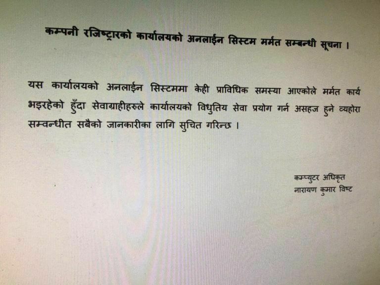 कम्पनी रजिस्ट्रारको कार्यलयले अनलाइन मार्फत सूचना प्रकाशित गरेर अनलाइन सिस्टममा केहि समस्या आएकोले मर्मत कार्य भइरहेको हुँदा अनलाइन सेवा प्रयोग गर्न असहज हने जानकारी गराएको थियो । र अनलाइन दर्ता करिब ४ दिन देखि मर्मतमा रहेको सूचनाको मितिले देखाउँछ ।