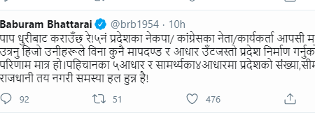 सामाजिक सञ्जाल ट्वीटरमा एक ट्वीट गर्दै डाक्टर भट्राईले पहिचानका ५ आधार र सार्मथ्यका ४ आधारमा प्रदेशको संख्या सीमा नाम र राजधानी तय नगरी नहुने पनि बताएका छन् । हेर्नुहोस् उनको ट्वीट :
