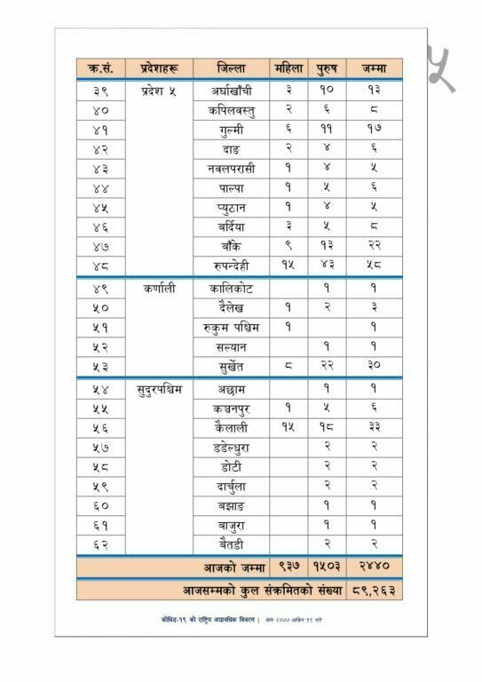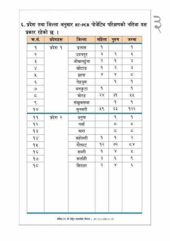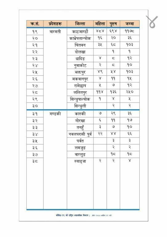 स्वास्थ्य तथा जनसंख्या मन्त्रालयका अनुसार ५ महिला र १४ जना पुरुषको कोरोनाबाट मृत्यु भएको हो । काठमाडौंमा तीन महिलासहित ९ जनाको मृत्यु भएको छ । मन्त्रालयका अनुसार काठमाडौंमा ७६ वर्षिया, ८१ वर्षिया र ८३ वर्षिया महिलाको मृत्यु भएको छ । यस्तै काठमाडौंमै २६ वर्षिय, ६५ वर्षिय, ६७ वर्षिय, ७८ वर्षिय, ८१ वर्षिय, ९१ वर्षिय पुरुषको मृत्यु भएको छ । पर्सामा ६५ र गोरखामा ४५ वर्षिया महिलाको मृत्यु भएको छ । भने, यस्तै ललितपुरमा ३ वर्षिय बालक, ५५ वर्षिय पुरुष र ७१ वर्षिय पुरुषको मृत्यु भएको मन्त्रालयले जनाएको छ । यसैगरी सर्लाहीमा ४२ वर्षिय र ६९ वर्षिय पुरुष, सुनसरीमा ५५ वर्षिय पुरुष चितवनमा ६२ वर्षिय पुरुष नवलपरासीपूर्वमा ३६ वर्षिय पुरुषको मृत्यु भएको छ । यो सँगै नेपालमा कोरोनाबाट मृत्यु हुनेको संख्या ५ सय ५४ पुगेको छ ।