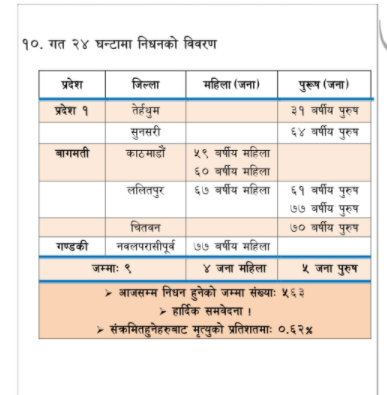 स्वास्थ्य तथा जनसंख्या मन्त्रालयका अनुसार ४ महिला र ५ जना पुरुषको कोरोनाबाट मृत्यु भएको छ । आज काठमाडौं उपतयकामा मात्रै २ पुरुष सहित ५ जनाको मृत्यु भएको छ । काठमाडौंमा ५९ र ६० वर्षिया महिला तथा ललितपुरमा ६७ वर्षिया महिलाको मृत्यु भएको छ । यस्तै ललितपुरमै ६१ र ७७ वर्षिय पुरुषको मृत्यु भएको छ । यसैगरी तेह्रथुममा ३१ वर्षिय, सुनसरीमा ६४ वर्षिय पुरुष र चितवनमा ७० वर्षिय पुरुष तथा नवलपरासीपूर्वमा ७७ वर्षिया महिलाको मृत्यु भएको छ । यो सँगै नेपालमा कोरोनाबाट मृत्यु हुनेको संख्या ५ सय ६३ पुगेको छ ।