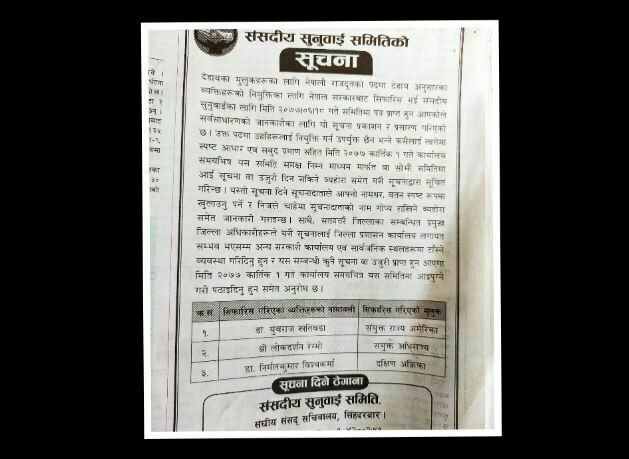 सरकारले डा युवराज खतिवडा, लोकर्दशन रेग्मी र निर्मलकुमार विश्वकर्मालाई राजदूतको लागि सिफारिस गरेको छ । समितिले बिहीवार एक सूचना जारी गर्दै उक्त पदमा उनीहरु उपयुक्त नभएमा यथेष्ट प्रमाणसहित उनीहरु उपयुक्त पात्र छैनन् भन्ने सूचना दर्ता गर्नको लागि आह्वान गरेको हो । त्यसको लागि समितिले कार्तिक १ गतेसम्मका लागि समय दिएको छ ।