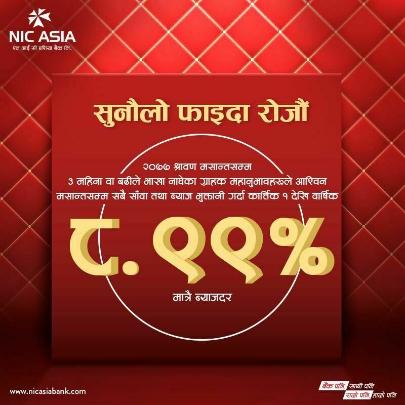 काठमाडौं । सहज एवं सबल बैंकिङ्गको मूल सिद्घान्त अनुरुप उत्तरदायी बैंकिङ्गको अभ्यास गर्दै आएको एन आई सी एशिया बैंकले covid-19 बाट आफ्ना ऋणीहरूमा परेको असर न्यूनीकरण गर्न समयअनुरुप विभिन्न ग्राहकमैत्री सहुलियतका योजनाहरू ल्याइरहेको अवस्थामा २०७७ श्रावण मसान्तसम्म ३ महिना वा बढीले बक्यौताको भाखा नाघेका कर्जाहरूको २०७७ आश्विन मसान्तसम्मको साँवा तथा ब्याज रकम सोही मसान्तभित्र चुक्ता भुक्तान गरेमा साविकको ब्याजदरलाई घटाई १ कात्र्तिक २०७७ देखि लागू हुनेगरी ८.९९ प्रतिशत ब्याजदर कायम गरिने योजना ल्याएको छ ।