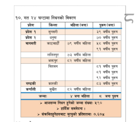 पछिल्लो २४ घण्टामा नेपालमा कोरोनाको कारण थप १२ जनाको मृत्यु भएको स्वास्थ्य तथा जनसंख्या मन्त्रालयले जनाएको छ ।