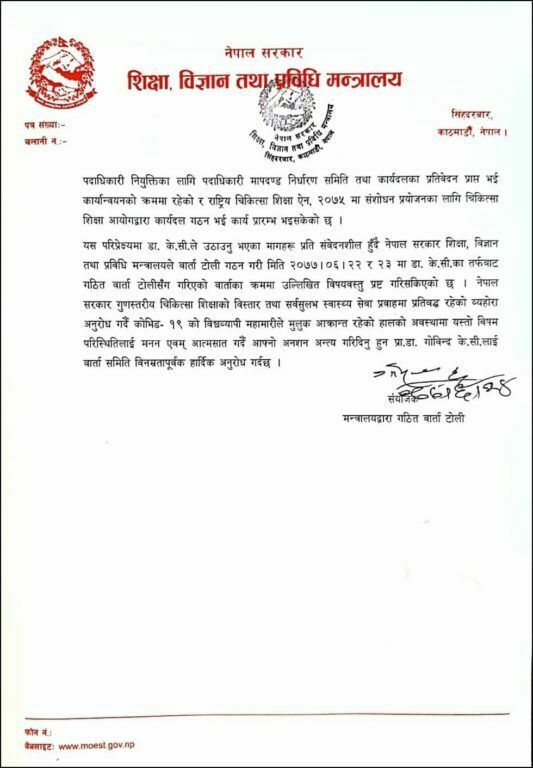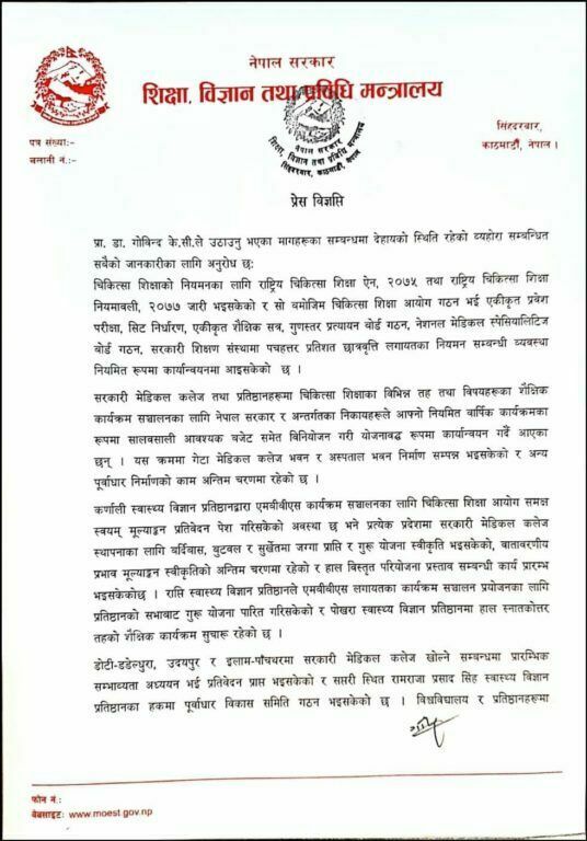 चिकित्सा शिक्षाको नियमनका लागि राष्ट्रिय चिकित्सा ऐन, २०७५ तथा राष्ट्रिय चिकित्सा शिक्षा नियमावली, २०७७ जारी भइसकेको र सो बमोजिम चिकित्सा शिक्षा आयोग गठन भइ एकीकृत प्रवेश परीक्षा सिट निर्धारण, एकीकृत शैक्षिक सत्र, गुणस्तर प्रत्यायन बोर्ड गठन, नेसनल मेडिकल स्पेसियालिटिज बोर्ड गठन, सरकारी शिक्षण संस्थामा ७५ प्रतिशत छात्रबृत्ति लगायतका नियमन सम्बन्धि व्यवस्था कार्यान्वयनमा आइसकेको विज्ञप्तिमा उल्लेख छ ।