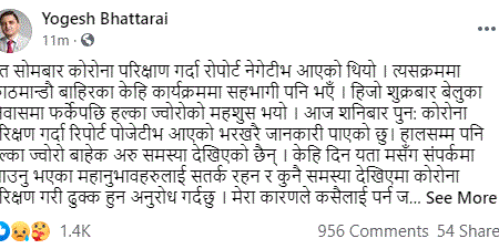 सामाजिक सञ्जाल फेसबुकमा एक उनले भनेका छन्, ‘गत सोमवार कोरोना परिक्षण गर्दा रोपोर्ट नेगेटीभ आएको थियो । त्यसक्रममा काठमाडौं बाहिरका केहि कार्यक्रममा सहभागी पनि भएँ । हिजो शुक्रवार बेलुका निवासमा फर्केपछि हल्का ज्वोरोको महशुस भयो । आज शनिवार पुनः कोरोना परीक्षण गर्दा रिपोर्ट पोजेटीभ आएको भर्खरै जानकारी पाएको छु। हालसम्म पनि हल्का ज्वोरो बाहेक अरु समस्या देखिएको छैन । केहि दिन यता मसँग सम्पर्कमा आउनु भएका महानुभावहरुलाई सतर्क रहन र कुनै समस्या देखिएमा कोरोना परीक्षण गरी ढुक्क हुन अनुरोध गर्दछु । मेरा कारणले कसैलाई पर्न जाने असुबिधाप्रति क्षमाप्राथी छु । होसियार रहनु र परिआएमा सामना गर्नु बाहेक के नै पो बिकल्प छ र ?’