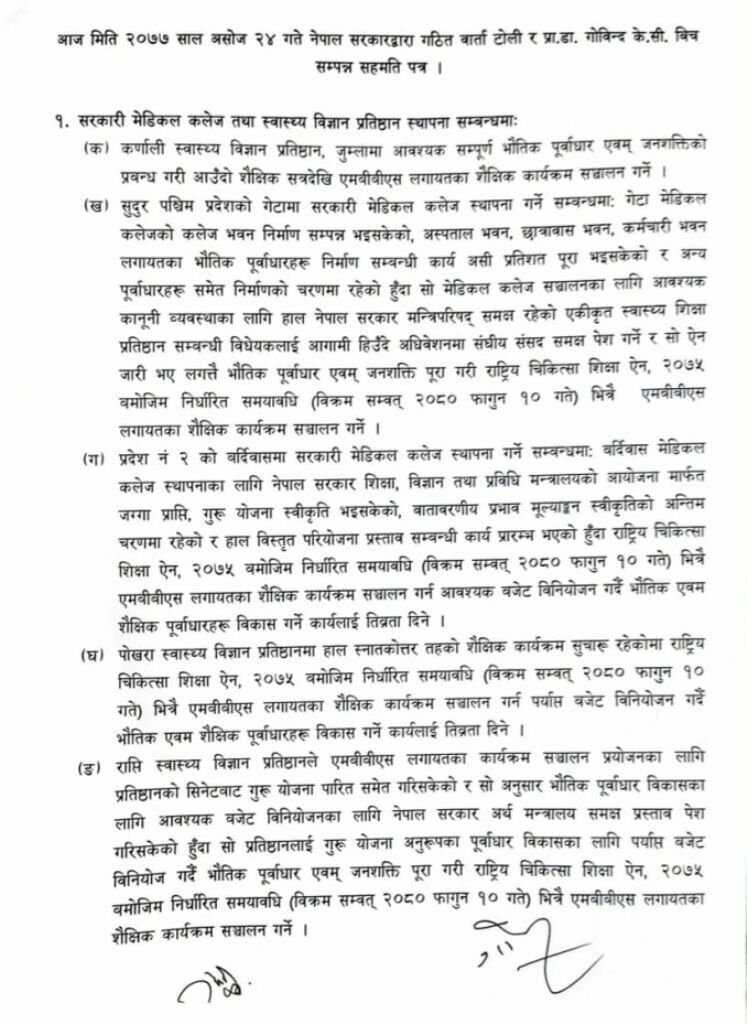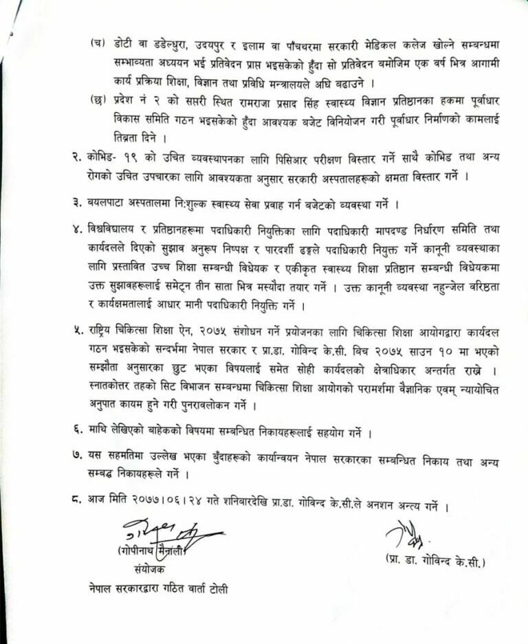 ८ बुँदे सहमतिमा शिक्षा सचिव तथा सरकारी वार्ता टोलीका संयोजक गोपीनाथ मैनाली र डा केसीले हस्ताक्षर गरेका छन् ।
