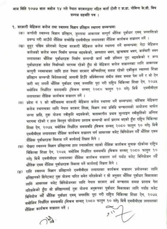 १. कर्णाली स्वास्थ्य विज्ञान प्रतिष्ठानमा तत्काल पूर्वाधार र जनशक्ति पुर्याएर एमबीबीएस लगायतका कार्यक्रमहरु संचालन गरियोस् । गेटा मेडिकल कलेज र राप्ति स्वास्थ्य विज्ञान प्रतिष्ठानमा शीघ्र पूर्वाधार र जनशक्ति पुर्याएर पठनपाठन शुरू गरियोस् । प्रदेश नं दुई र गण्डकी प्रदेश तथा डोटी वा डडेल्धुरा,उदयपुर र इलाम वा पाँचथरमा सरकारी मेडिकल कलेज खोल्ने प्रक्रिया अघि बढाइयोस् ।