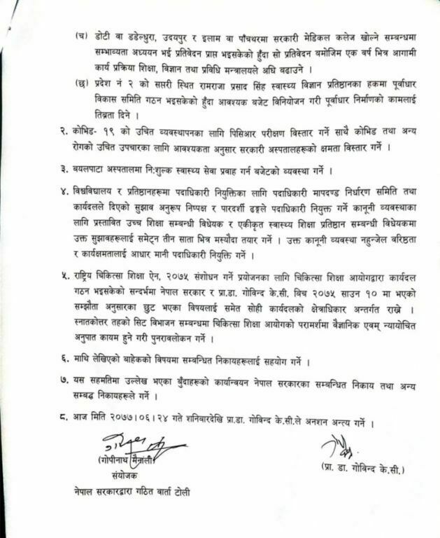 बिहीवार दुई पटक र शुक्रवार १ पटक वार्ता टोली छलफलमा बसेपनि कुनै निष्कर्ष निकाल्न सकेको थिएन् । तर शनिवार अबेर सरकारी टोलीका संयोजक डा गोपीकृष्ण मैनाली र डा केसीबीच ८ बुँदे सहमती भइ हस्ताक्षर गरेका थिए ।