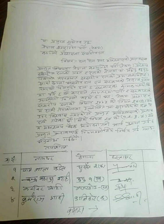 सांसदहरुले हस्ताक्षर गरेको पत्र कर्णाली प्रदेश संसदीय दलका प्रमुख सचेतक गुलावजंग शाहलाइ बुझाएका छन् । पत्रमा नेकपा संसदीइ दलका नेतासमेत रहेका मुख्यमन्त्री शाहीविरूद्व अविश्वासको प्रस्ताव गरिएको हो ।