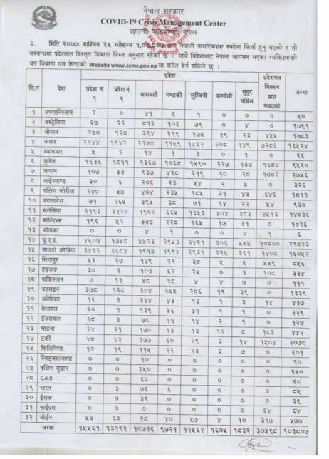 यस्तै हालसम्म १ लाख ३ हजार ८०७ नेपाली स्वदेश फर्किएका छन् भने नेपाली फर्किनेमध्ये सबैभन्दा धेरै युएईमा कार्यरत श्रमिकहरु रहेका छन् ।