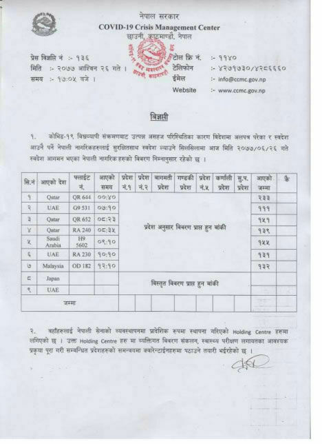 यस्तै हालसम्म १ लाख ३ हजार ८०७ नेपाली स्वदेश फर्किएका छन् भने नेपाली फर्किनेमध्ये सबैभन्दा धेरै युएईमा कार्यरत श्रमिकहरु रहेका छन् ।