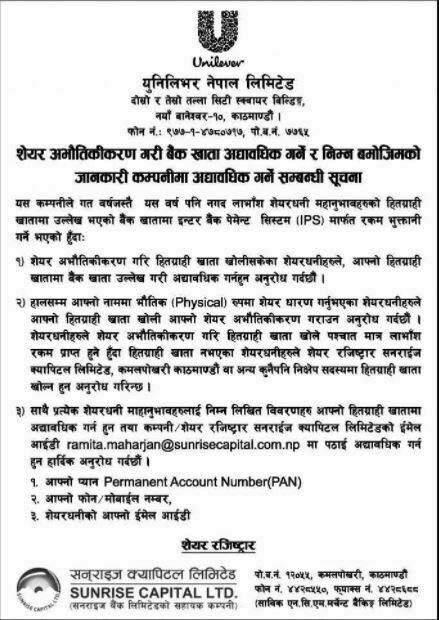 काठमाडौं । युनिलिभर नेपाल लिमिटेडले एक सूचना प्रकाशित गर्दै शेयरधनीहरूलाई शेयर अभौतिकीकरण गरी बैंक खाता अद्यावधिक गर्न अनुरोध गरेको छ ।
