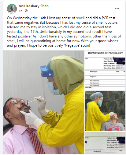 गत बुधवार शाहले आफ्नो गन्ध हराएको कारण पीसिआर परिक्षण गराएका थिए । तर त्यसबेला रिर्पोट नेगेटिभ आएको थियो । रिपार्ट नेगेटिभ आए पनि आइसोलेसनमा बसेर फेरि परिक्षण गराउँदा रिपार्ट पोजेटिभ आएको हो ।