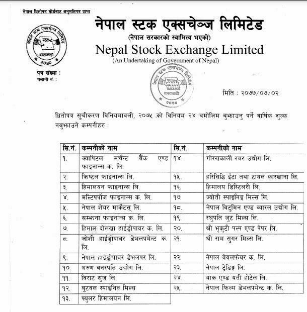 नेप्सेमा सूचीकृत करिब २०० वटा कम्पनीले नविकरण शुल्क बुझाएपनि हिमालयन डिष्ट्रिलरी, नेपाल हाइड्रोपावर, जोशी हाइड्रोपावर, हिमाल दोलखा हाइड्रोपावर मल्टिपर्पस फाइनान्स लगायतका कम्पनीले नविकरण शुल्क नबुझाएपछि नेप्सेले ती पच्चीस कम्पनीको आइतबार शेयर कारोबार रोक्का गरेको हो ।
