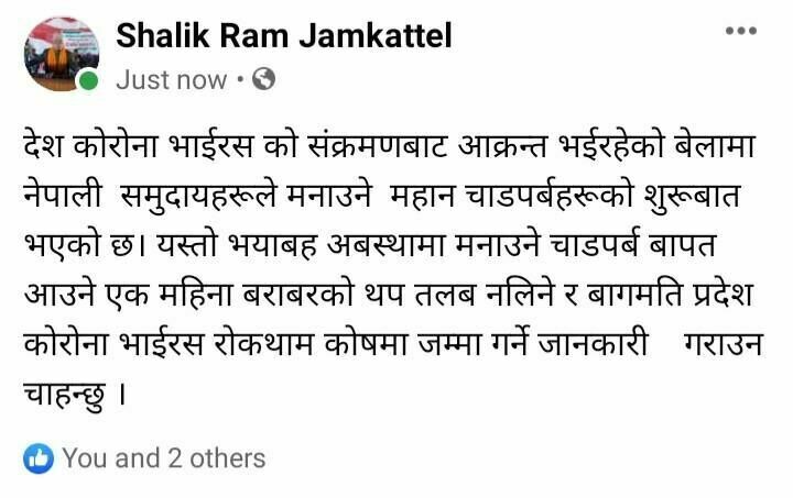 मन्त्री जम्कट्टेलले आफूले दशैँको लागि लिने तलब प्रदेशको कोरोना भाइरस रोकथाम तथा नियन्त्रण कोषमा जम्मा गर्ने घोषणा गरेका हुन् । कोरोना महामारीको भयाबहको अवस्थामा चाडपर्व बापत प्रदेश सरकारबाट आउने तलब रकम कोरोना कोषमा दिन लागेका हुन् ।
