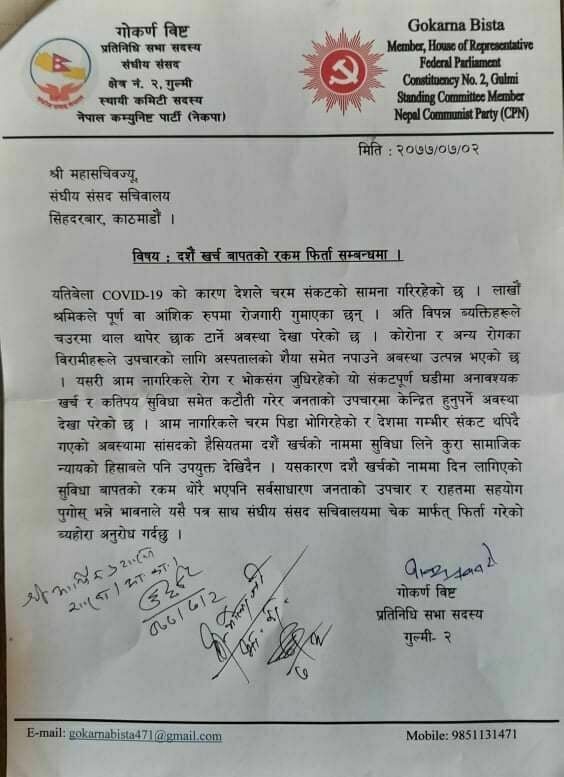 कोभिड १९ का कारण देशले चरम संकटको सामना गरिरहेको, अति विपन्न वर्गले चउरमा थाल थापेर छाक टारिरहेको अवस्था तथा विरामीहरुले उपचारका लागी अस्पतालको शैंया सेमत नपाएको अवस्थामा सांसदको हैसियतमा दशैं खर्चको नाममा सुविधा लिने कुरामा सामाजिक न्यायको हिसाबले पनि अनउपयुक्त देखिएको बताउँदै दशैं खर्चको चेक संघिय संसद सचिवालयमा फिर्ता गरिएको बताएका छन् ।