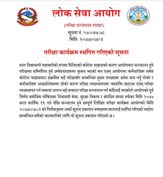 यसअघि आयोगले निर्णय गर्दै आगामी कार्तिक १६ गतेदेखि लिखित परीक्षा सञ्चालन गर्ने भन्ने निर्णय गरेको थियो । तर परीक्षामा सम्मिलित हुने परीक्षार्थीमा सिर्जना भएको भय तथा आयोगमा समेत कोरोना भाइरसको संक्रमण देखिएकाले लिखित परीक्षा स्थगित गरिएको आयोगले जनाएको छ ।