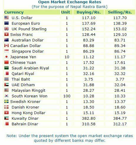 नेपाली मुद्रा बजारको सबैभन्दा महङ्गो मानिने मुद्रा कुवेती दिनार १ को खरिददर ३८२ रुपैयाँ ८० पैसा र बिक्रिदर ३८४ रुपैयाँ ७७ पैसा निर्धारण गरेको छ भने बहराईन दिनार १ को खरिददर ३१० रुपैयाँ ५८ पैसा र विक्रिदर ३१२ रुपैयाँ १७ पैसा रहेको छ ।