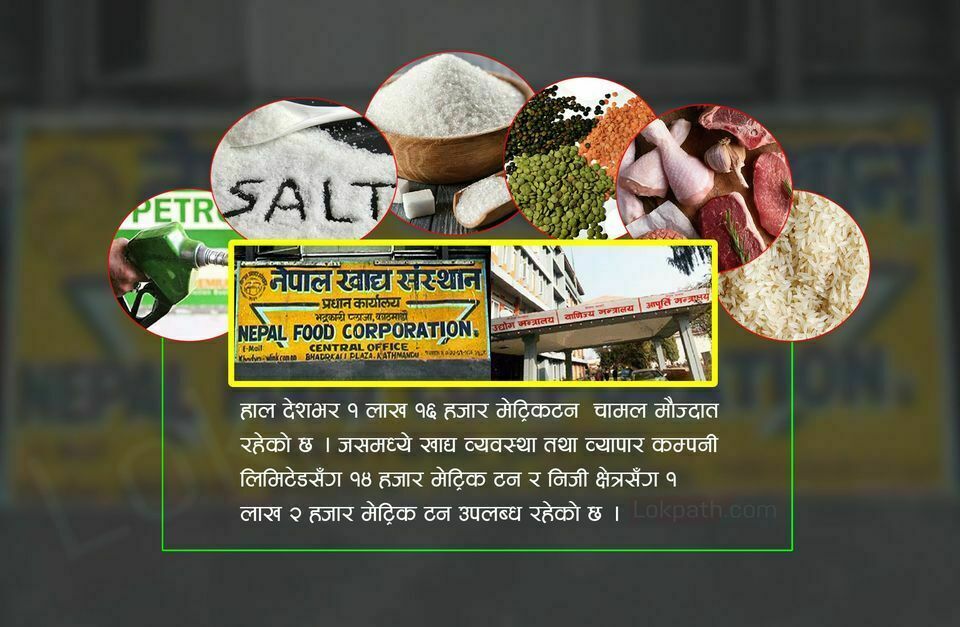 हाल देशभर १ लाख १६ हजार मेट्रिकटन चामल मौज्दात रहेको छ । जसमध्ये खाद्य व्यवस्था तथा व्यापार कम्पनी लिमिटेडसँग १४ हजार मेट्रिक टन र निजी क्षेत्रसँग १ लाख २ हजार मेट्रिक टन उपलब्ध रहेको छ ।