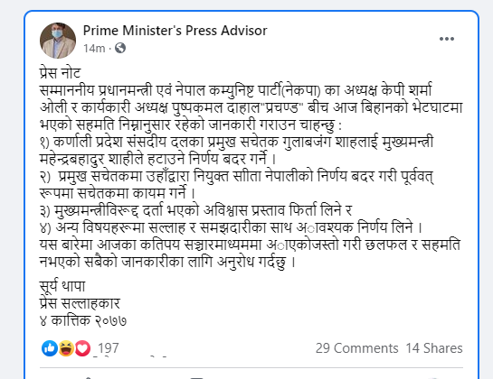 थापाका अनुसार कर्णाली प्रदेश संसदीय दलका प्रमुख सचेतक गुलाबजंग शाहलाई मुख्यमन्त्री महेन्द्रबहादुर शाहीले हटाउने निर्णय बदर गर्ने निर्णय भएको छ । त्यस्तै मुख्यमन्त्री शाहीविरुद्धको अविश्वास प्रस्तावलाई फिर्ता लिने लगायतका निर्णयहरु भएको सल्लाहकार थापाले जानकारी दिए ।