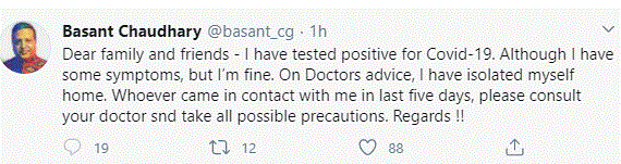 चौधरीलेले आफूलाई कोरोनाको केही लक्षण देखिएको तर स्वास्थ्य अवस्था भने सामान्य रहेको बताएका छन् । साथै चिकित्सकको सल्लाहमा आफू घरकै आइसोलेसनमा बसेको पनि उनले जानकारी गराएका छन् ।