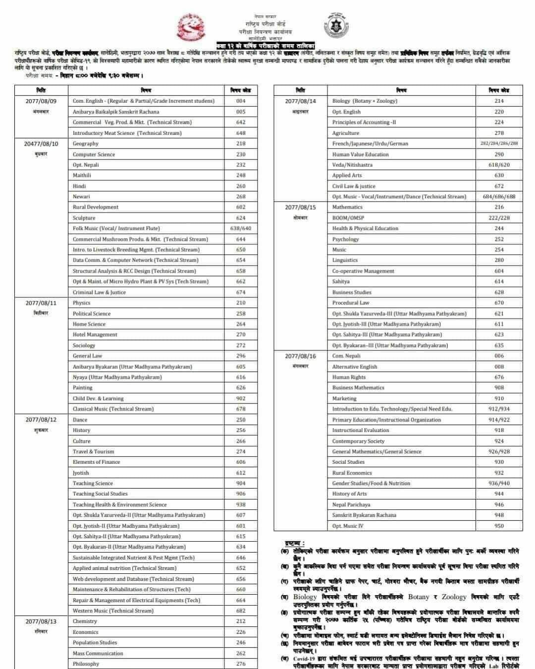 अब सरकारले तोकेको जनस्वास्थ्यका मापदण्ड कायम गर्दै सामाजिक दूरी कायम गरी परीक्षा सञ्चालन गर्न लागिएको राष्ट्रिय परीक्षा बोर्डले जनाएको छ । बोर्डका अनुसार परीक्षा तालिका र कार्यविधि समेत तयार गरी परीक्षा सञ्चालन गर्न लागिएको हो ।