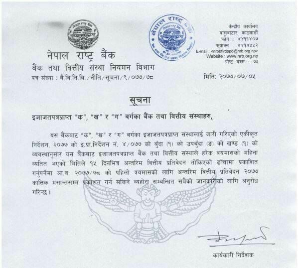 बैंक तथा वित्तीय वित्तीय संस्थाले हरेक त्रैमास अन्त्य भएको १५ दिन भित्र अन्तरिम वित्तीय प्रतिवेदन प्रकाशन गर्नु पर्ने व्यवस्था छ । बुधबारको नयाँ व्यवस्थाले बैंक वित्तीय संस्थाले थप १५ दिन समय पाएका छन् ।
