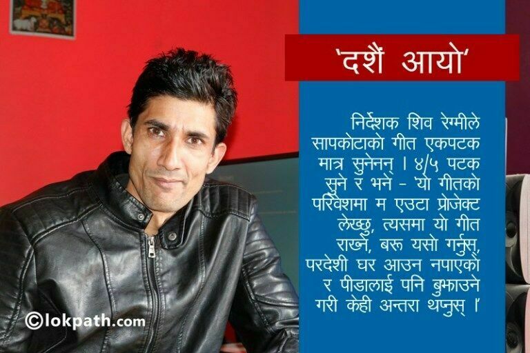 निर्देशक रेग्मीले सापकोटाको गीत एकपटक मात्र सुनेनन् । ४र५ पटक सुने र भने – ‘यो गीतको परिवेशमा म एउटा प्रोजेक्ट लेख्छु, त्यसमा यो गीत राख्ने, बरु यसो गर्नुस्, परदेशी घर आउन नपाएको र पीडालाई पनि बुझाउने गरी केही अन्तरा थप्नुस् ।’