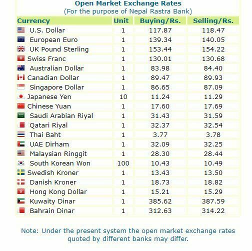 नेपाली मुद्रा बजारको सबैभन्दा महङ्गो मुद्रा कुवेती दिनार १ को खरिददर ३८५ रुपैयाँ ६२ पैसा र बिक्रीदर ३८७ रुपैयाँ ५९ पैसा निर्धारण गरेको छ भने बहराईन दिनार १ को खरिददर ३१२ रुपैयाँ ६३ पैसा र बिक्रीदर ३१४ रुपैयाँ २२ पैसा रहेको छ ।