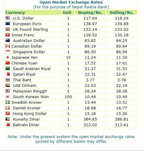 नेपाली मुद्रा बजारको सबैभन्दा महङ्गो मुद्रा कुवेती दिनार १ को खरिददर ३८४ रुपैयाँ ८५ पैसा र बिक्रीदर ३८६ रुपैयाँ ८१ पैसा निर्धारण गरेको छ भने बहराईन दिनार १ को खरिददर ३१२ रुपैयाँ २ पैसा र बिक्रीदर ३१३ रुपैयाँ ६१ पैसा रहेको छ ।