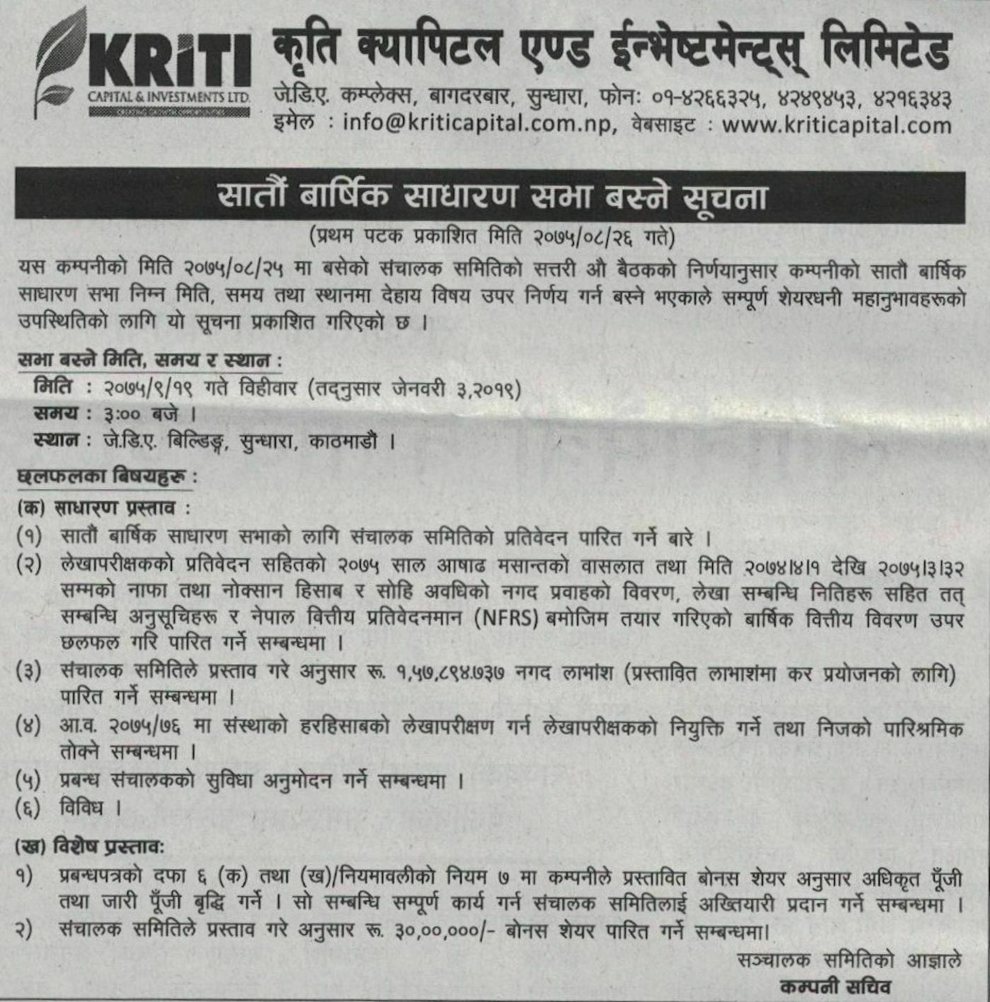 काठमाडौं । कृति क्यापिटल एण्ड इन्भेष्टमेन्ट लिमिटेडले वार्षिक साधारण सभा आह्वान गरेको छ ।