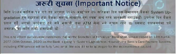 काठमाडौं । हिमालयन बैंक लिमिटेडले आफ्ना ग्राहकहरूका लागि अत्यन्त जरूरी सूचना प्रकाशन गरेको छ ।