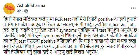 उनले लेखेका छन्, ‘हिजो नेपाल मेडिकल कलेजमा पिसिआर टेष्ट रिपोर्ट पोजेटिभ आएकोले मसँग सम्पर्कमा आएका परिवारका सदस्य, साथीभाइ, इष्टमित्र, अफिसका स्टाफहरुलाई समेत सतर्क र सुरक्षित रहन र लक्षण नदेखिएपछि टेष्ट गर्न हुन अनुरोध छ’ शर्माले फेसबुकमा अगाडि लेखेका छन् ‘मलाई पनि कुनै लक्षण थिएन । दशैँ मानेर घरबाट फर्किएपछि सर्तकताका लागि टेष्ट गराउदा पोजेटिभ देखिएको हो ।’