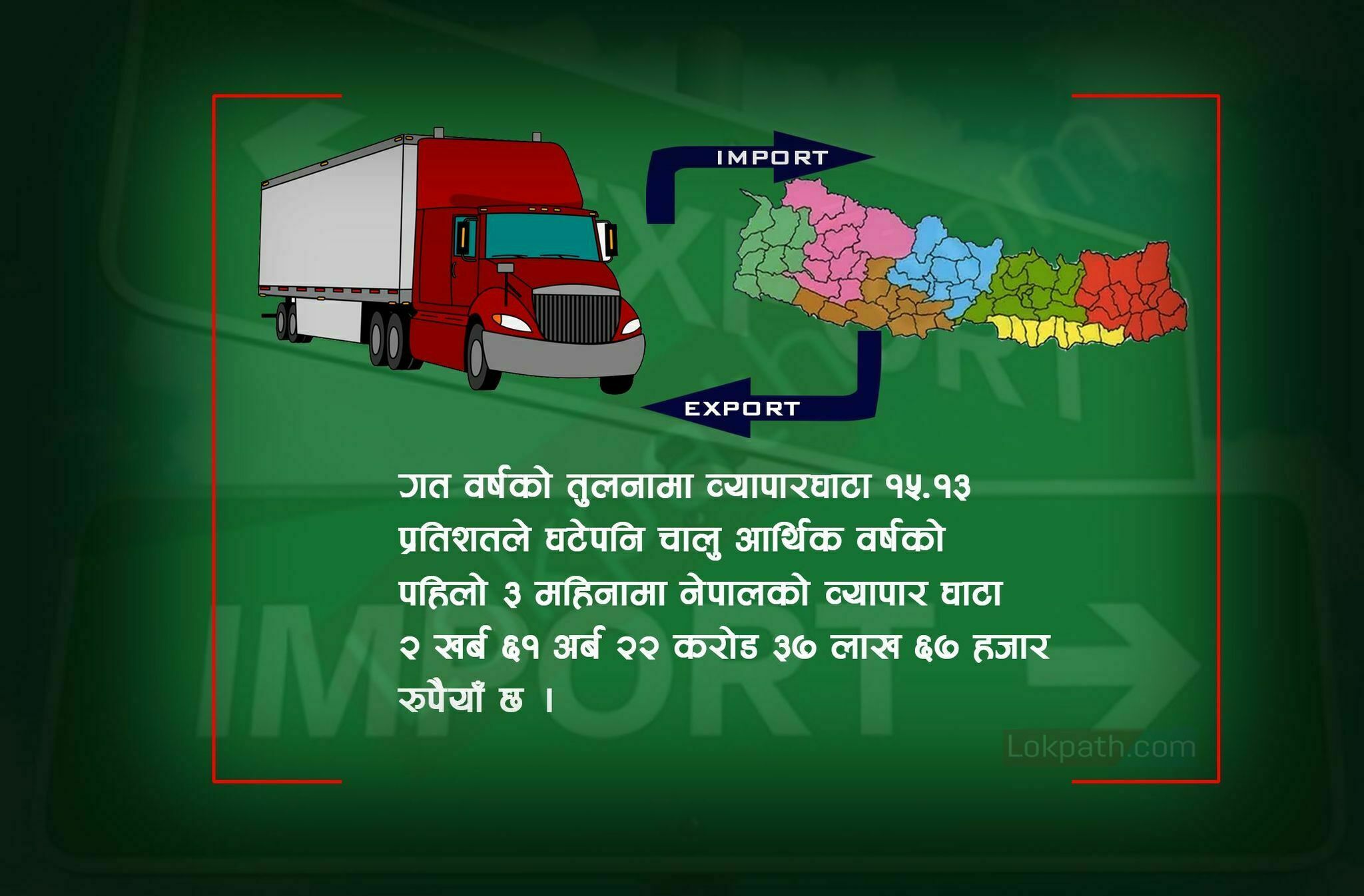 गत वर्षको तुलनामा व्यापारघाटा १५.१३ प्रतिशतले घटेपनि चालु आर्थिक वर्षको पहिलो ३ महिनामा नेपालको व्यापार घाटा २ खर्ब ६१ अर्ब २२ करोड ३७ लाख ६७ हजार रुपैयाँ छ । ४६ अर्ब ५५ करोड ८८ लाख २५ हजार रुपैयाँले भने व्यापार घाटा सुधारीएको छ ।