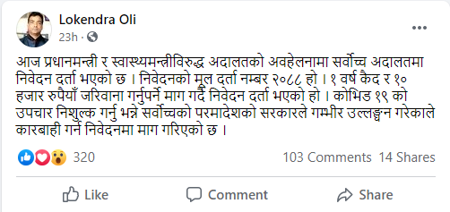 कोभिड १९ को उपचार निशुल्क गर्नु भन्ने सर्वोच्चको परमादेशको सरकारले गम्भीर उल्लङ्घन गरेको भन्दै कारबाहीको माग राख्दै अधिवत्ताद्वय लोकेन्द्रबहादुर ओली र केशरजंग केसीले मुद्धा दर्ता गराएका हुन्।
