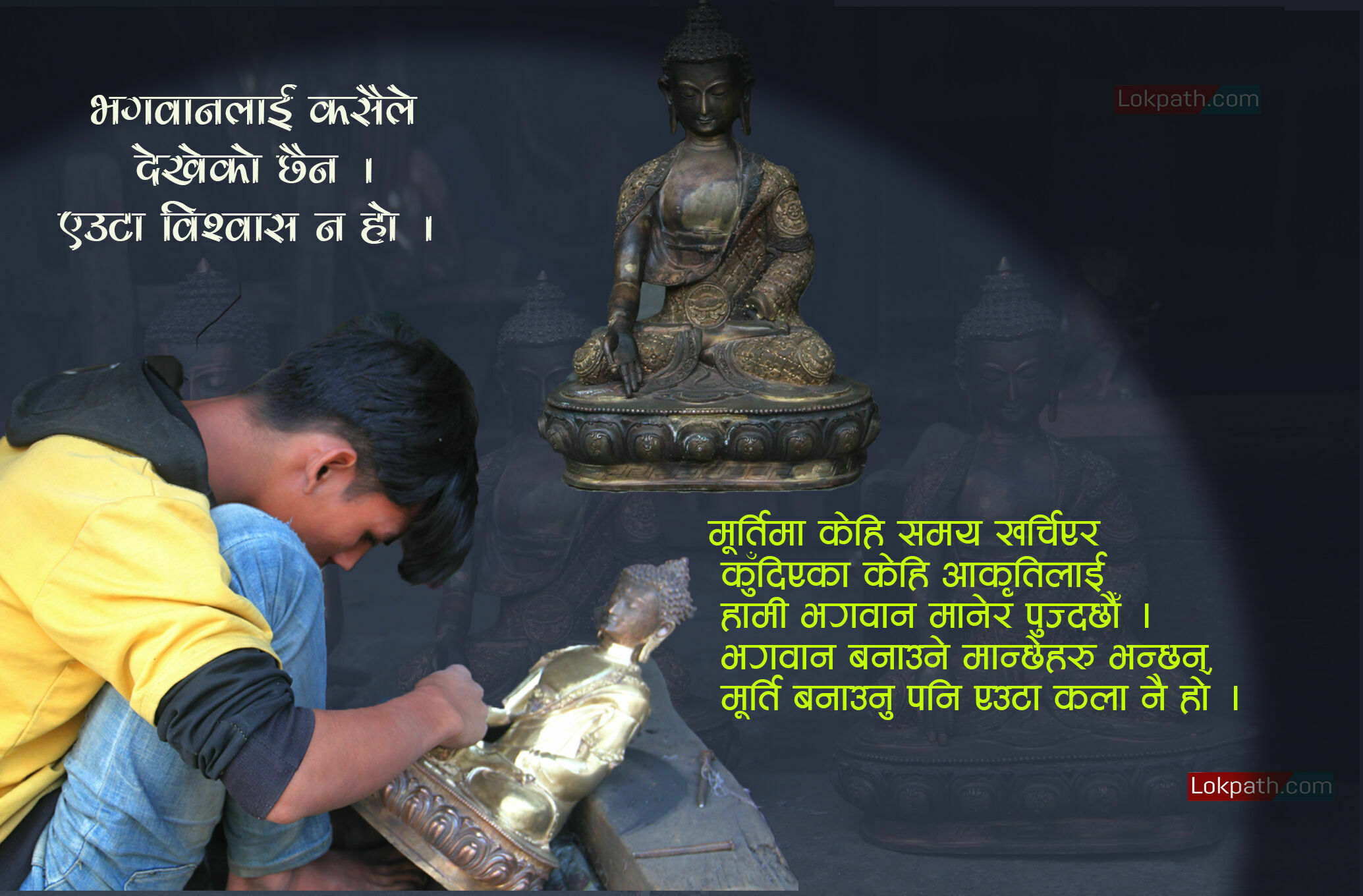 भगवानलाई कसैले देखेको छैन । एउटा विश्वास न हो । मूर्तिमा केहि समय खर्चिएर कुँदिएका केहि आकृतिलाई हामी भगवान मानेर पुज्दछौँ । भगवान बनाउने मान्छेहरु भन्छन्, मूर्ति बनाउनु पनि एउटा कला नै हो ।