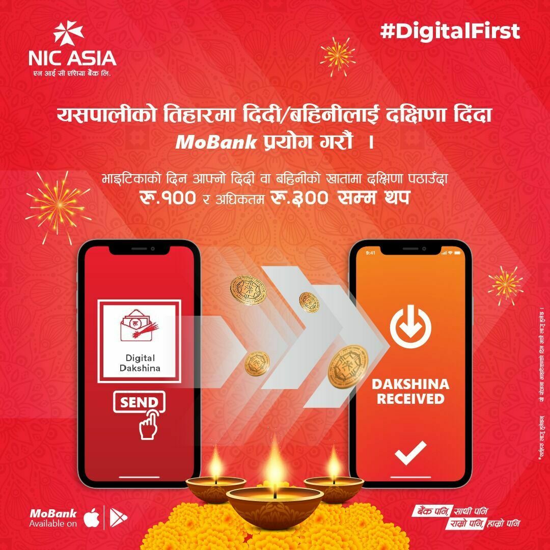 ‘सोच बदलौं’ भन्ने नारालाई आत्मसात गर्दै आइरहेको एन आई सी एशियाले भाईटिकामा ग्राहकहरूले आफ्ना दिदीबहिनीलाई दिने दक्षिणा बैंकको मोबाइल बैंकिङ्ग (MoBank) मार्फत प्रदान गरेमा दक्षिणा रकममा थप १०० बैंकले आफ्नो तर्फबाट प्रदान गर्ने बैंकले जनाएको छ ।