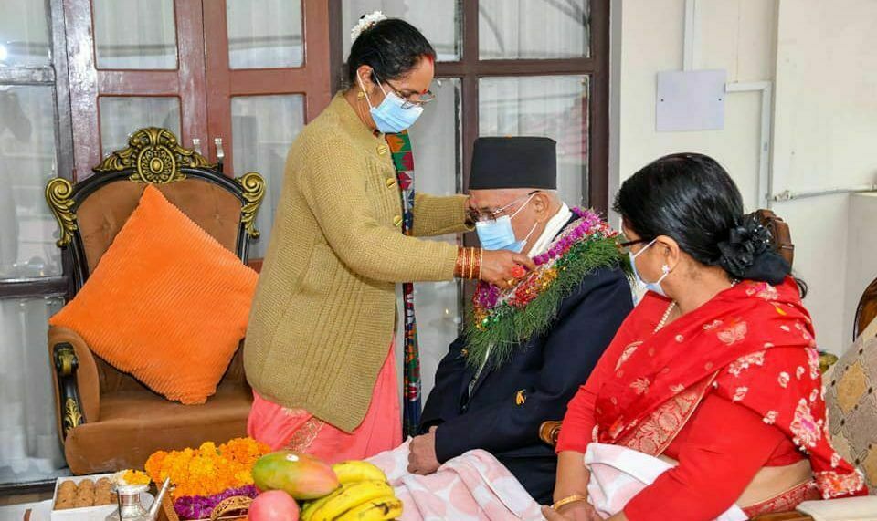 कोइरालाले प्रधानमन्त्री ओलीलाई सप्तरंगी टीका, मखमलीका साथै दुबोको माला पहिरियाइदिएकी थिइन् भने सगुन समेत दिइन् । यस्तै प्रधानमन्त्री पत्नी राधिका शाक्यलाई समेत कोइरालाले टीका लगाइदिएकी थिइन् ।