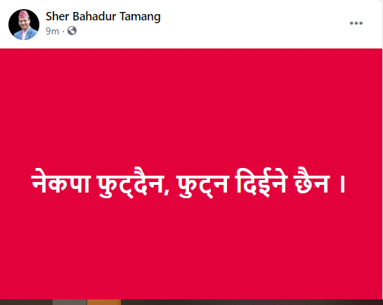 बुधवार सामाजिक सञ्जालमा लेख्दै नेता तामाङले भने, “नेकपा फुट्दैन, फुट्न दिईने छैन ।”