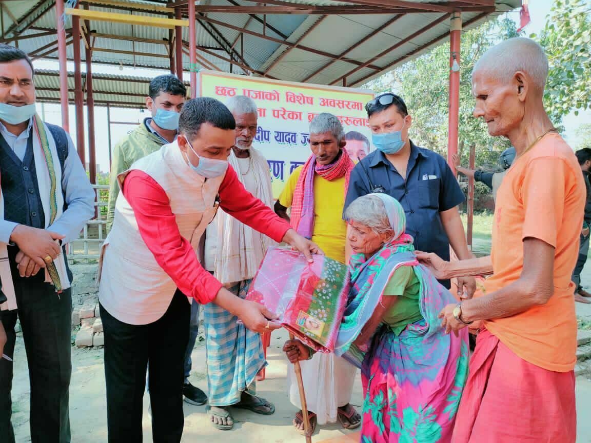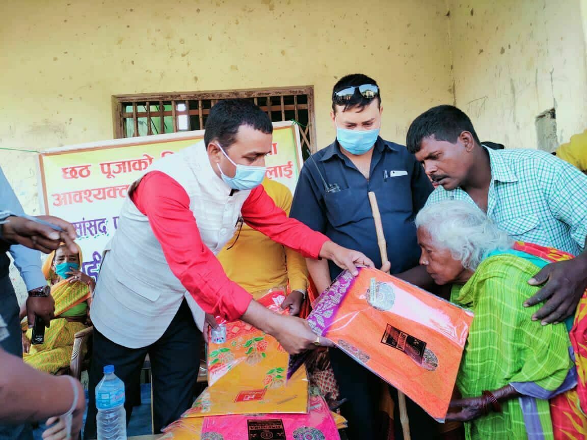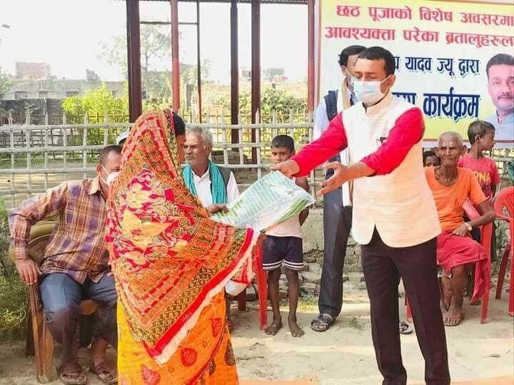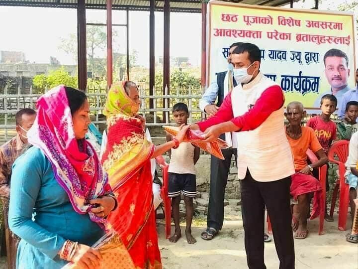नयाँ र चोखो कपडा लगाई तलाउमा स्नान गरी शुद्धतालाई विशेष ध्यान दिइने छठ पर्वको अवसरमा आर्थिक रुपले विपन्न परिवारका व्रतालुहरुलाई आफूले पाउने सेवा सुबिधाबाट साडी वितरण गरिएको र आगामी वर्षहरुमा समेत यसलाई निरन्तरता दिने सांसद यादवको प्रतिवद्धता छ ।