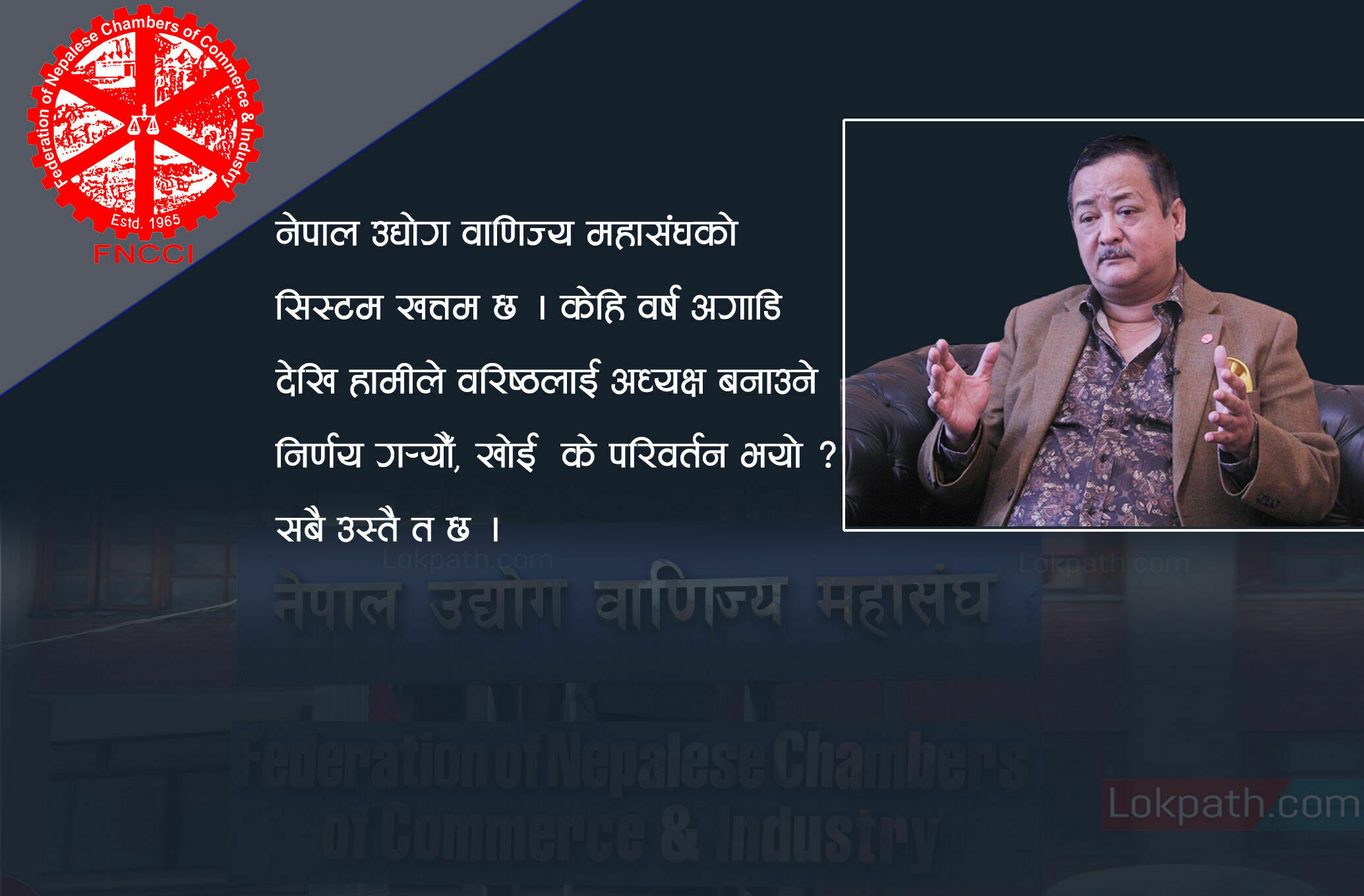 नेपाल उद्योग वाणिज्य महासंघको सिस्टम खत्तम छ । केहि वर्ष अगाडी देखि हामीले वरिष्ठलाई अध्यक्ष बनाउने निर्णय ग-यौँ खोई के परिवर्तन आयो ? के फरक भयो ? सबै उस्तै त छ । महासंघमा भएको व्यक्ति, पदाधीकारीहरु आफ्नो व्यक्तिगत जिवनमा जस्तो छन् उस्तै देखाउन सक्ने हुनुपर्छ । केहि समय अगाडी महासंघमा आउट स्वर्सीङ गरेर एच. आर को आवश्यकता अध्ययन गराइयो । ५ ७ लाख रुपैयाँ खर्च पनि गरियो, आवश्यकता के ? प्रगती के ? महासंघ सरकार र नीजी क्षेत्र बिचको पुलको काम गर्ने संस्था हो । तर महासंघको सचिवालय कहिल्यै बलियो हुन सकेन । म महासंघमा छिरेदेखि अहिलेसम्म बलियो सचिवालय देखेको छैन । चाकडीप्रथादेखि विभिन्न कुराहरुले महासंघलाई गलाएको छ । भावी अध्यक्ष पनि पहिले देखिए जस्तो छैनन् । जुन सक्षमताको आधारमा हामीले उनलाई वरिष्ठ उपाध्यक्ष बनाएका थियौँ अब अध्यक्ष बन्ने बेलामा त्यो सक्षमता केहि कमजोर देखिएको छ । तर यसको मतलब मैले उनलाई असक्षम भन्न खोजेको होइन एज लङ एज हि डु गुड आइ विल अलवेज हेल्प हिम ।