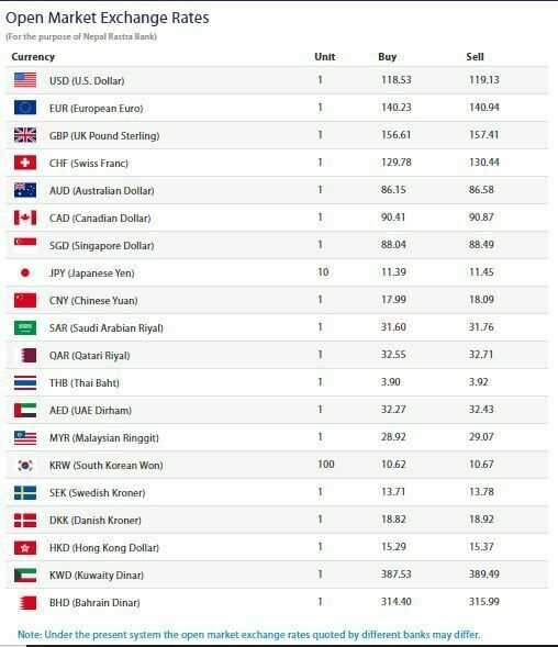 नेपाली मुद्रा बजारको सबैभन्दा महङ्गो मुद्रा कुवेती दिनार १ को खरिददर ३८७ रुपैयाँ ५३ पैसा र बिक्रीदर ३८९ रुपैयाँ ४९ पैसा निर्धारण गरेको छ भने बहराईन दिनार १ को खरिददर ३१४ रुपैयाँ ४० पैसा र बिक्रीदर ३१५ रुपैयाँ ९९ पैसा रहेको छ ।