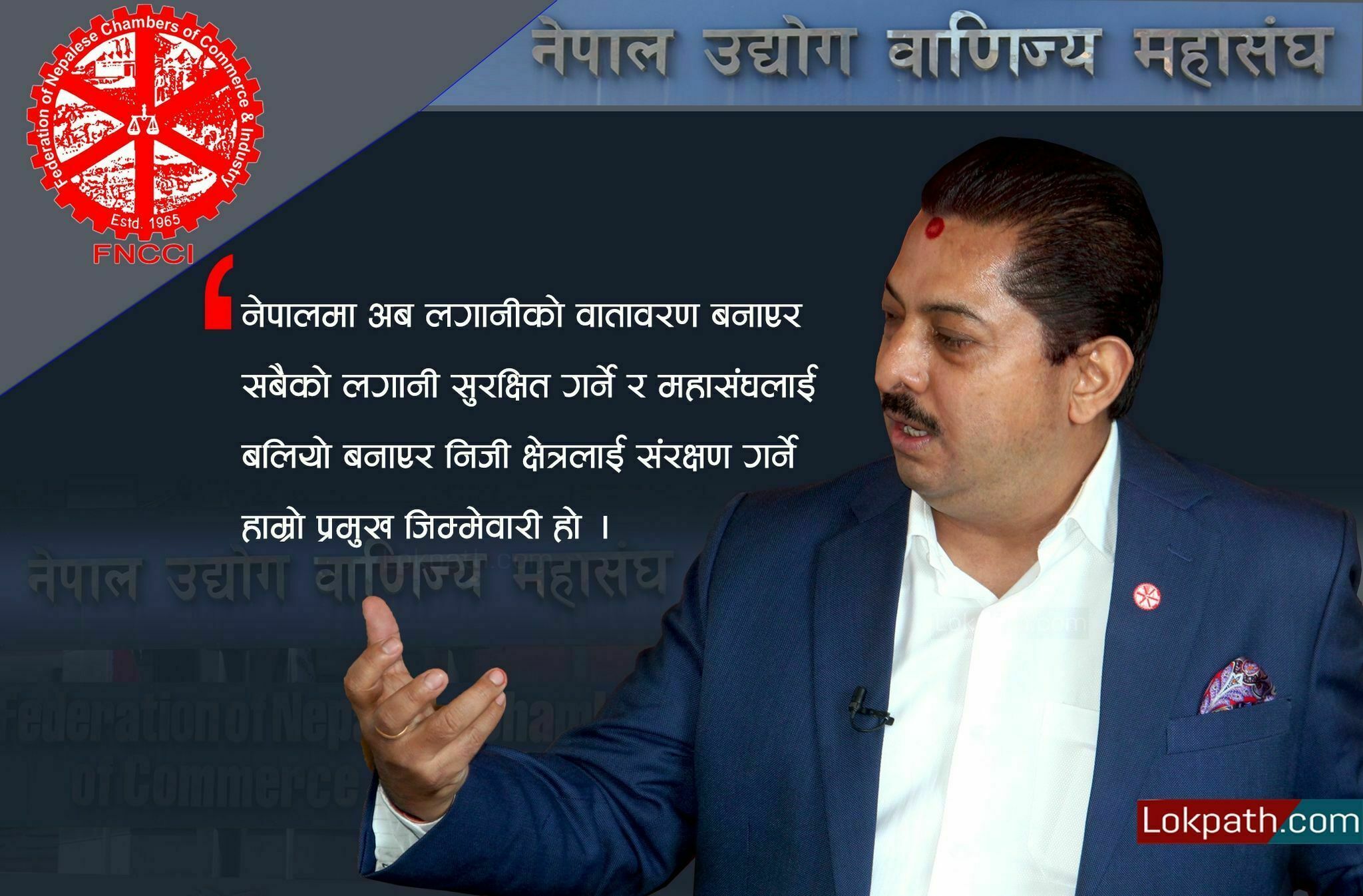 देशको अर्थव्यवस्था हेर्नुहुन्छ भने ७० प्रतिशत भन्दा धेरै हिस्सा निजी क्षेत्रको रहेको छ । सरकारले समृद्ध नेपाल सुखि नेपालीको नारा लगाईरहँदा देशको अर्थतन्त्रमा निजी क्षेत्रको योगदान ७० प्रतिशत भन्दा माथि चाहन्छन् । राज्यको अर्थतन्त्रको धरोहर भनेकै निजी क्षेत्र हो र अब अर्थतन्त्र घान्ने काम पनि निजी क्षेत्रले नै गर्नेछ । चालू आर्थिक वर्षको अन्त्यमा राज्यको आर्थिक वृद्धि हेर्ने हो भने शुन्य अथवा ऋणात्मक हुने अवस्था देखिन्छ । यसलाई बढाउन देशको जिडिपीलाई पुरानै लयमा फर्काउन आवश्यक रहेको छ । जिडिपीको वृद्धिदर १० प्रतिशतको बनाउन पर्ने एउटा ठूलो जिम्मेवारी निजी क्षेत्रको रहेको छ ।