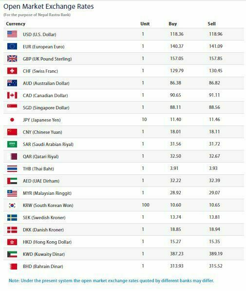 नेपाली मुद्रा बजारको सबैभन्दा महङ्गो मुद्रा कुवेती दिनार १ को खरिददर ३८७ रुपैयाँ २३ पैसा र बिक्रीदर ३८९ रुपैयाँ १९ पैसा निर्धारण गरेको छ भने बहराईन दिनार १ को खरिददर ३१३ रुपैयाँ ९३ पैसा र बिक्रीदर ३१५ रुपैयाँ ५२ पैसा रहेको छ ।