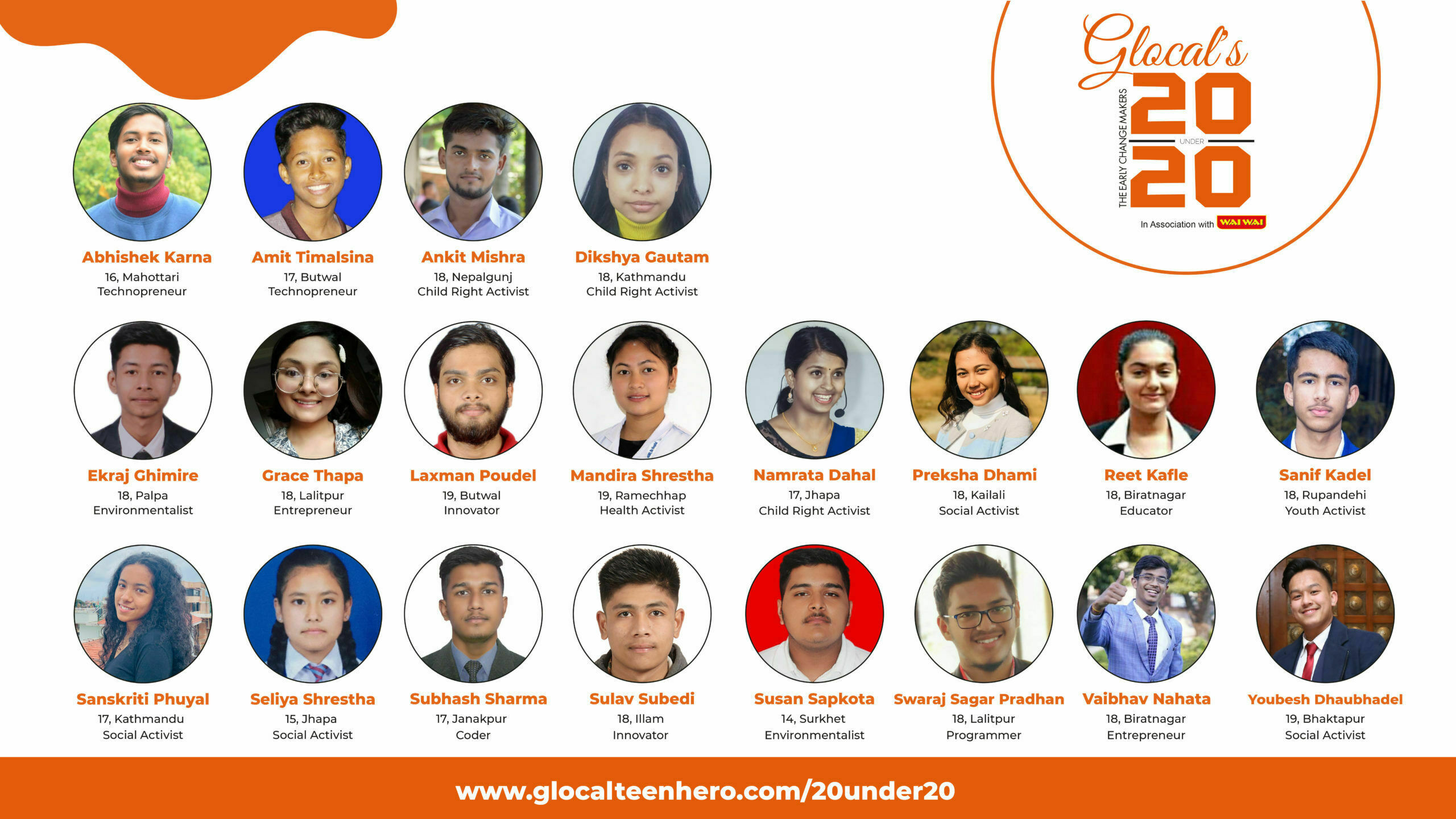ग्लोकल प्रा ली र वाईवाईको संयुक्त आयोजनामा नेपालका २० वर्षभन्दा कम उमेरका २० उत्कृष्ट किशोरकिशोरीहरुको सूची सार्वजनिक गरिएको हो । ती किशोरकिशोरीहरु समाजसेवा, बालअधिकार, खेलकुद, कृषि, मिडिया, पत्रकारिता, विज्ञान, प्रविधि र उद्यमशीलता, बातावरण संरक्षणजस्ता विविध क्षेत्रमा काम गरेर सकारात्मक सन्देश प्रवाह गरेको जनाइएको छ ।