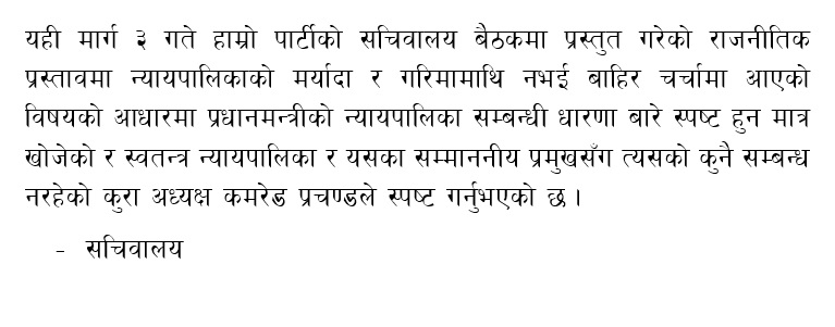 उनको सचिवालयले आज मंगलवार एक प्रस्टीकरण दिँदै स्वतन्त्र न्यायपालिका र यसका प्रमुखसँग आफूले उल्लेख गरेको विषयको कुनै सम्बन्ध नरहेको उल्लेख गरेको छ ।