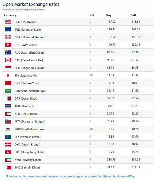 नेपाली मुद्रा बजारको सबैभन्दा महङ्गो मुद्रा कुवेती दिनार १ को खरिददर ३८५ रुपैयाँ ७५ पैसा र बिक्रीदर ३८७ रुपैयाँ ७१ पैसा निर्धारण गरेको छ भने बहराईन दिनार १ को खरिददर ३१२ रुपैयाँ ७१ पैसा र बिक्रीदर ३१४ रुपैयाँ ३१ पैसा रहेको छ ।