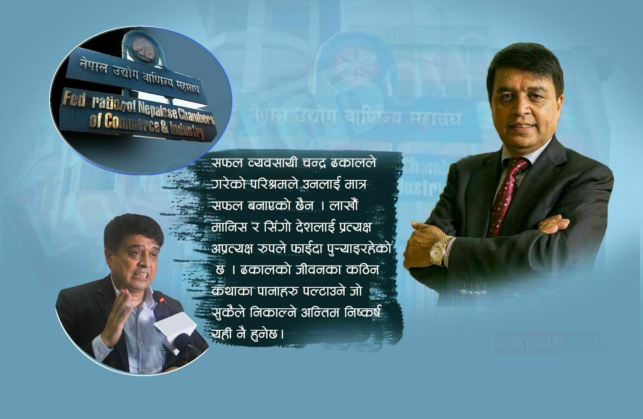 साना तथा मझौला व्यवसायको हकहित संरक्षण गर्न र नेपाल उद्योग वाणिज्य महासंघको नेतृत्व गरि देशको अर्थतनत्रलाई सबल बनाउन चन्द्र ढकालले नेतृत्वको लडाईमा भाग लिएका हुन् । चुवानको नतिजा त समयलेनै देखाउने छ तर उनको प्रतिस्प्रतिले पनि उनीमा अनुभव बाहेक कुनै कुराको कमी नरहेको बताउछन् ।