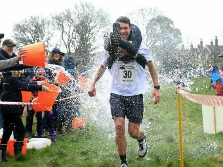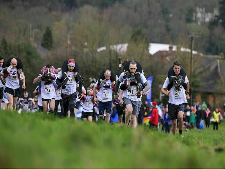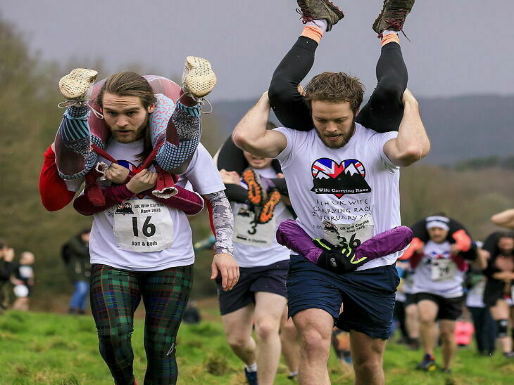 ४०० मिटरको यो दौडमा १५० श्रीमानहरु आफ्ना श्रीमतीलाई पिठ्युँमा बोकेर दौडिएका थिए । दौडमा भाग लिनको लागि आफ्नी श्रीमतीको तौल थोरैमा ५० ग्राम हुनु पर्दछ ।